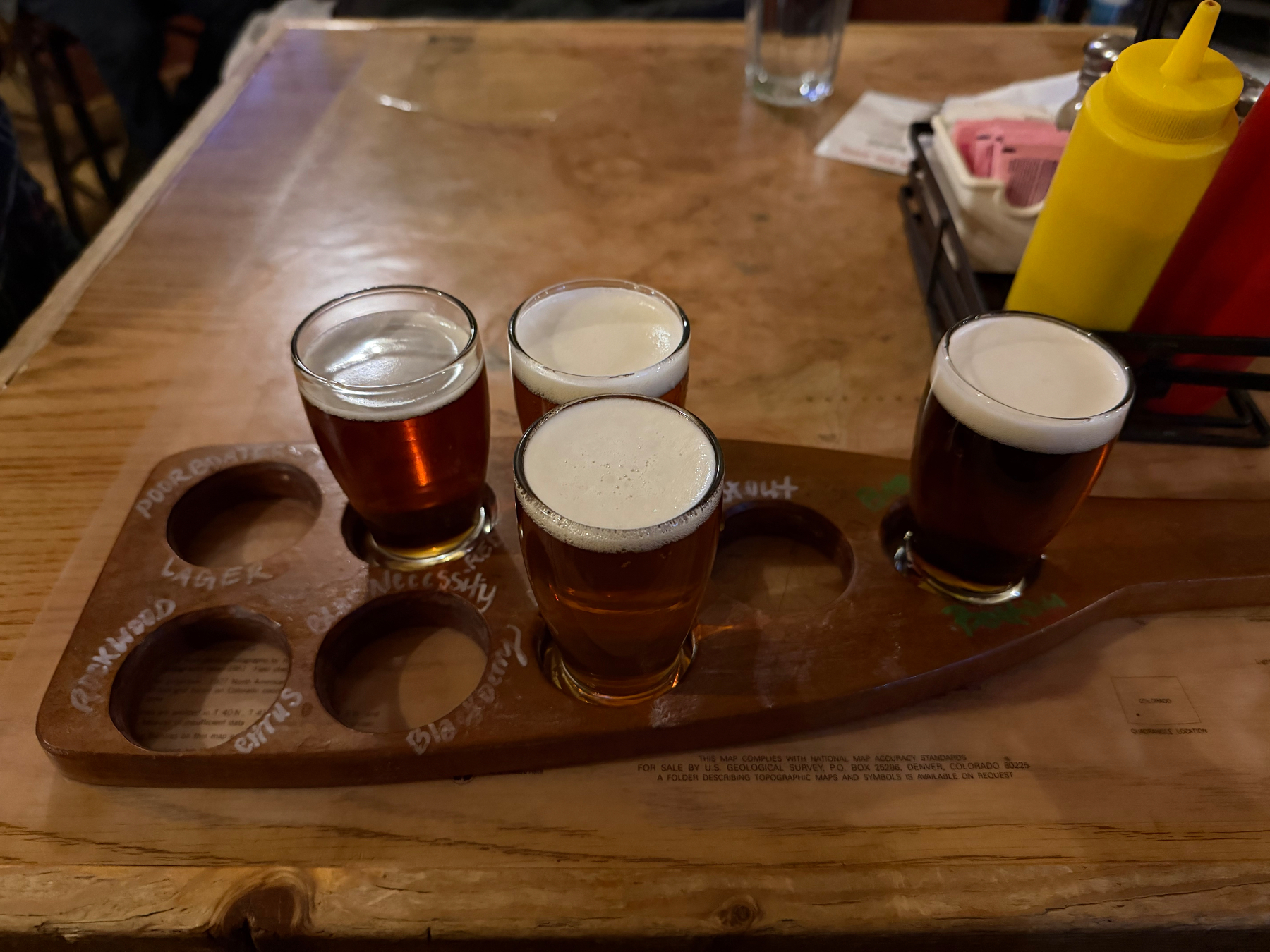 Dinner last night at Bottom Shelf Brewery in Bayfield. Ordered a flight assuming the usual four; turns out I could have gotten all eight at once. Had to order another to complete the set.